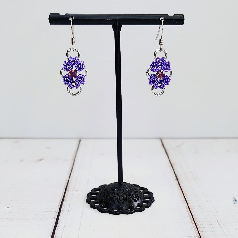 Handwoven 'romanov' chainmaille units made from bright aluminum and anodized aluminum rings with 4mm Preciosa Chaton Montee crystals in the shade 'Amethyst Opal.' on nickel free ear hooks. Earrings are extremely lightweight and quite dainty measuring just under 1" long.
