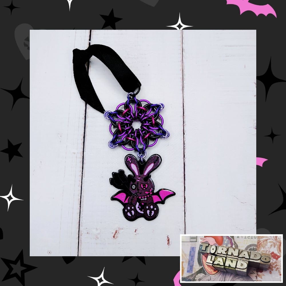 Bat-Bunny Snowflake OrnamentChainmaille ornament handwoven with anodized aluminum rings plus double sided acrylic charm. Ornament measures about 3.25" long including charm and comes with a length of ribbon as pictured.