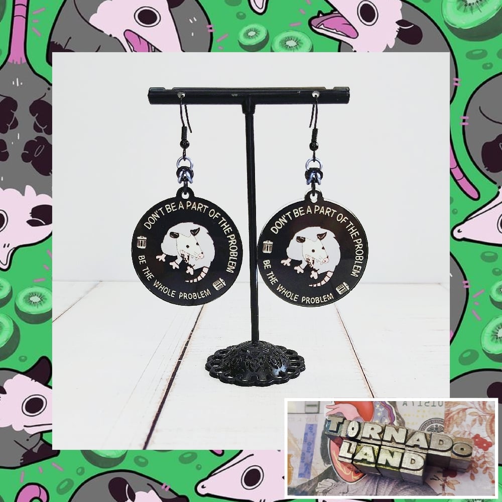 'Be the Whole Problem' EarringsHandwoven mini 'half byzantine' chainmaille units made from anodized aluminum rings with double sided acrylic charms on nickel free ear hooks. Earrings are extremely lightweight and measure just under 2" long.