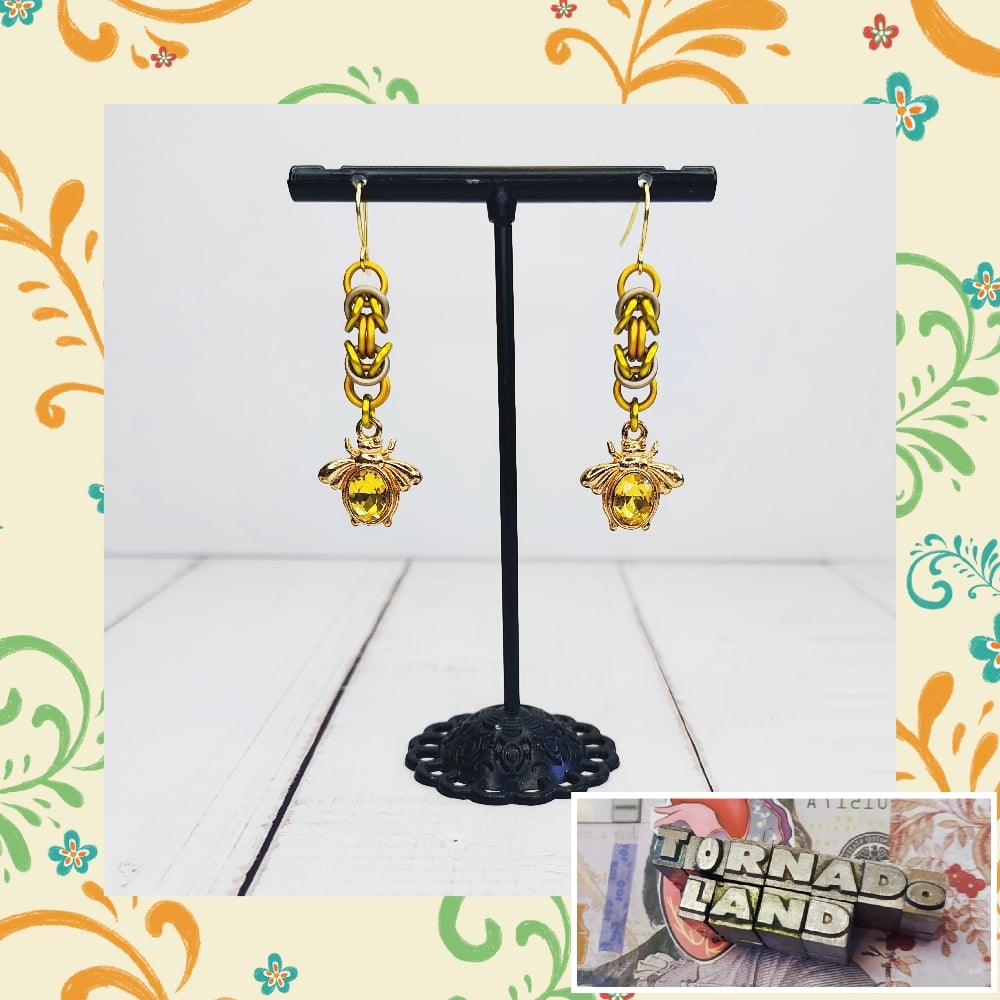 Bejeweled Bee EarringsHandwoven 'byzantine' chainmaille units made from anodized aluminum rings with enamel and rhinestone charms on nickel free ear hooks. Earrings are extremely lightweight and measure just over 1.5" long.
