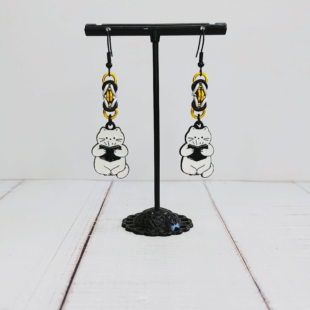 Bookish Cat EarringsHandwoven 'byzantine' chainmaille units made from anodized aluminum rings with enamel charms on nickel free ear hooks. Earrings are extremely lightweight and measure just under 2" long.