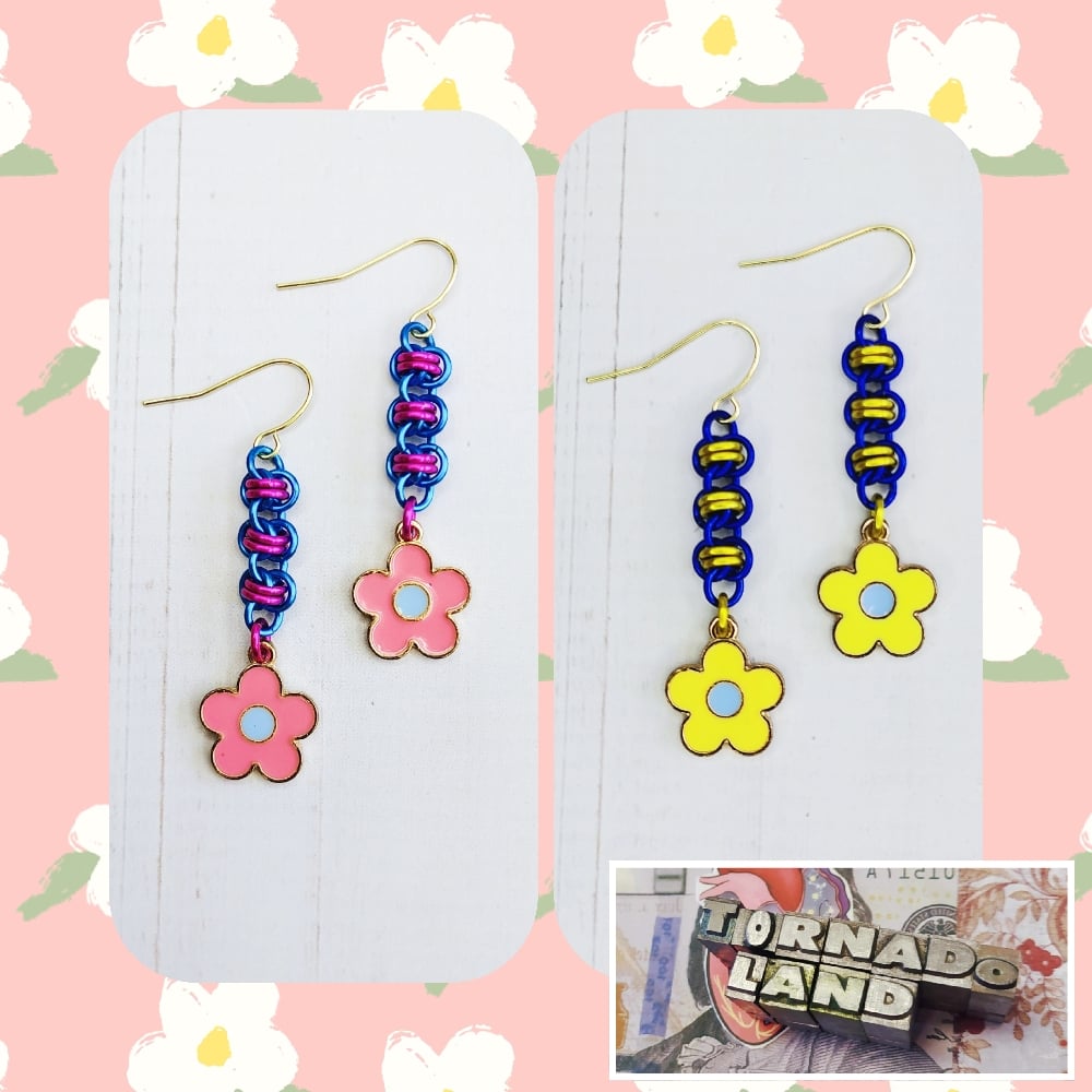 Handwoven mini 'barrel weave' chainmaille units made from anodized aluminum rings plus enamel charms on nickel free ear hooks. Earrings are extremely lightweight and measure just under 1.75" long.