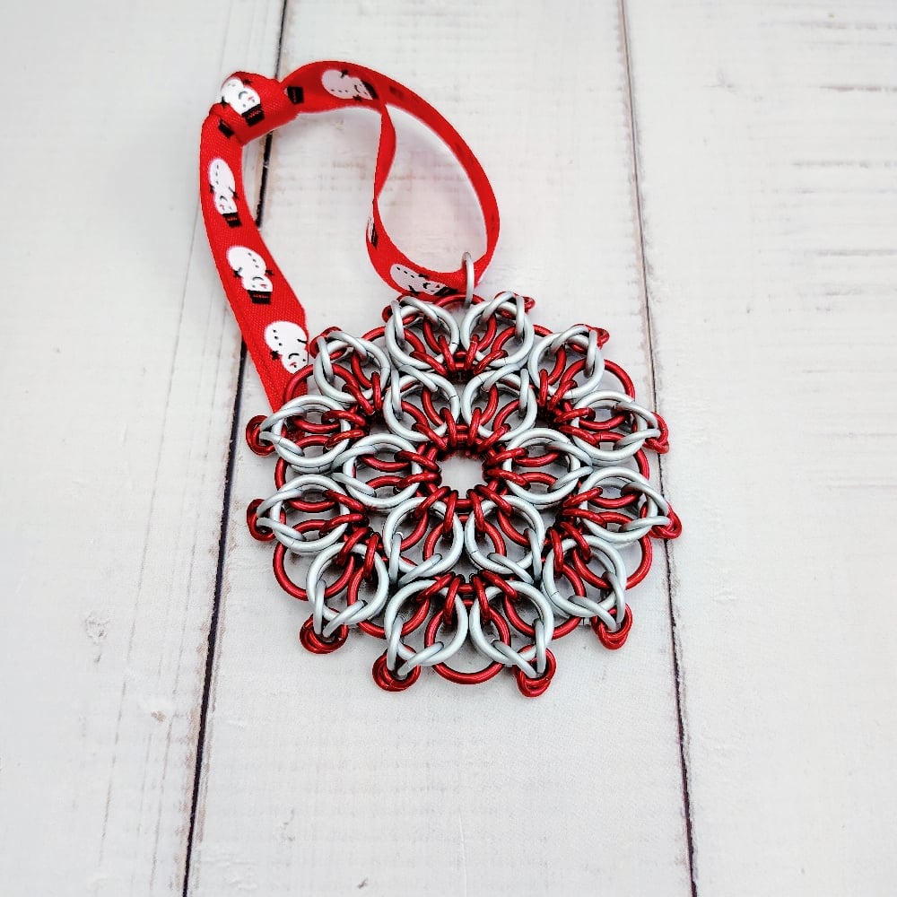 Handwoven chainmaille ornament made with anodized aluminum rings. Ornament measures 2.75 any which way and includes a length of ribbon.