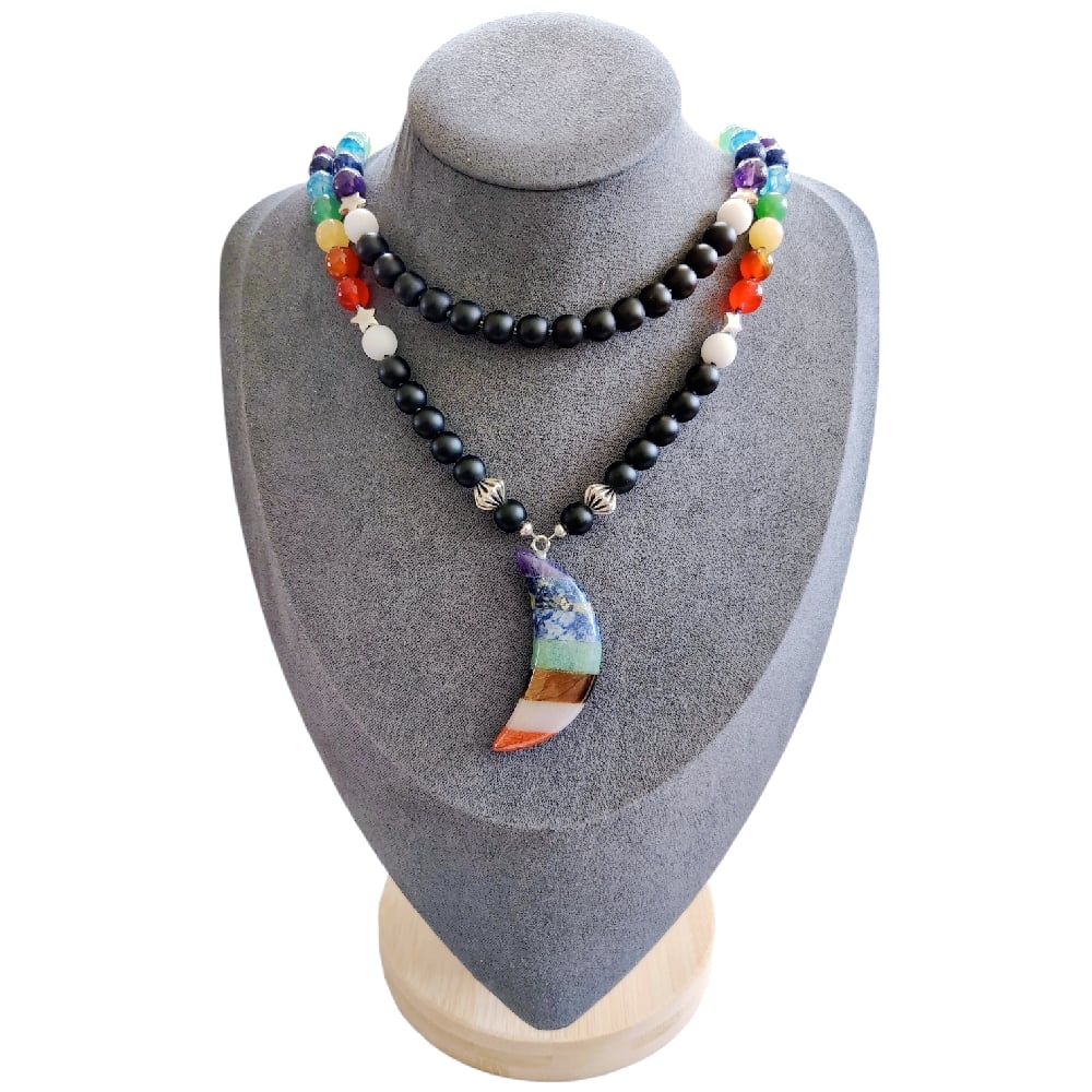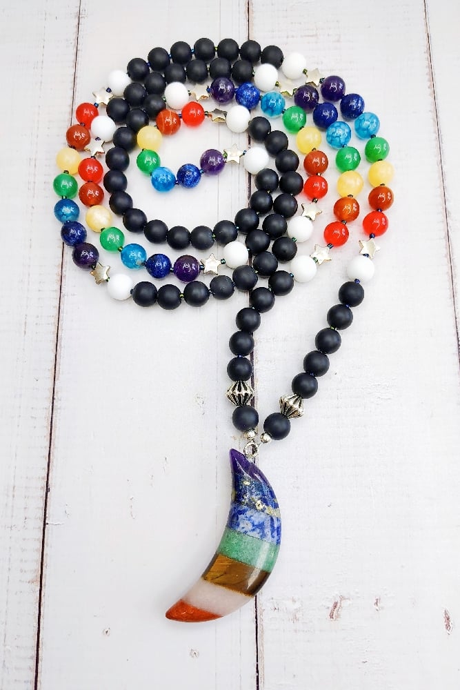 Meditation beads made with 54 Matte Onyx, 12 White Jade, and 6 each Red Jade, Carnelian, Calcite, Green Aventurine, Blue Crackle Agate, Lapis Lazuli, and Amethyst beads handstrung on stainless steel beading wire featuring a semi-precious mixed gemstone moon pendant. Mala measures just shy of 40” around and pendant measures about 2” tall.