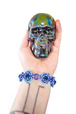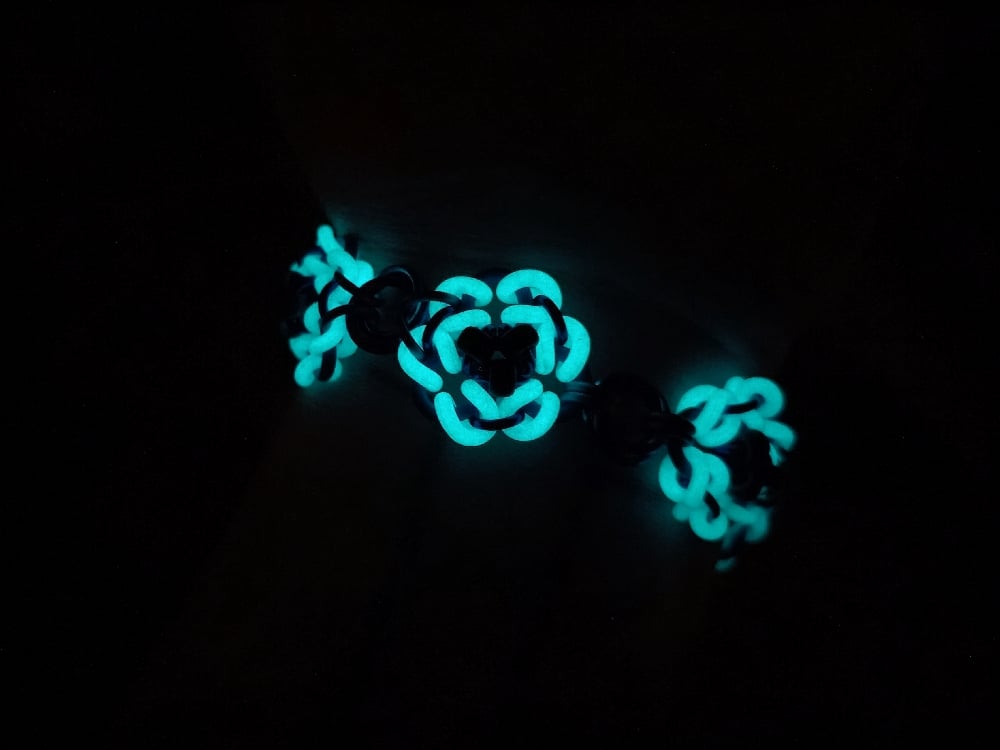 Handwoven glow-in-the-dark EPDM (latex free) rubber rings and anodized aluminum rings with Miyuki glass seed beads. Bracelet measures 8" and closes with a stainless steel lobster claw clasp