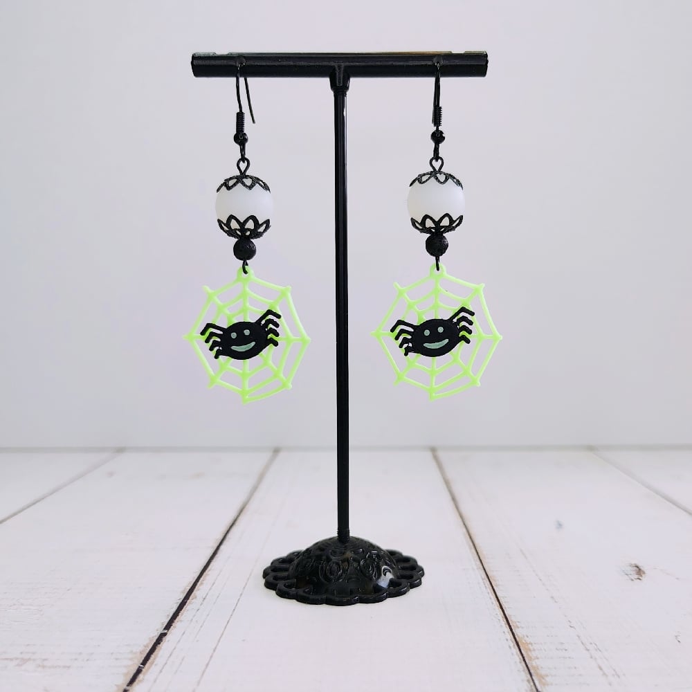 12mm glow-in-the-dark silicone beads and 4mm lava rock beads with glow-in-the-dark acrylic charms on nickel free ear hooks. Earrings are very lightweight and measure 2" long.