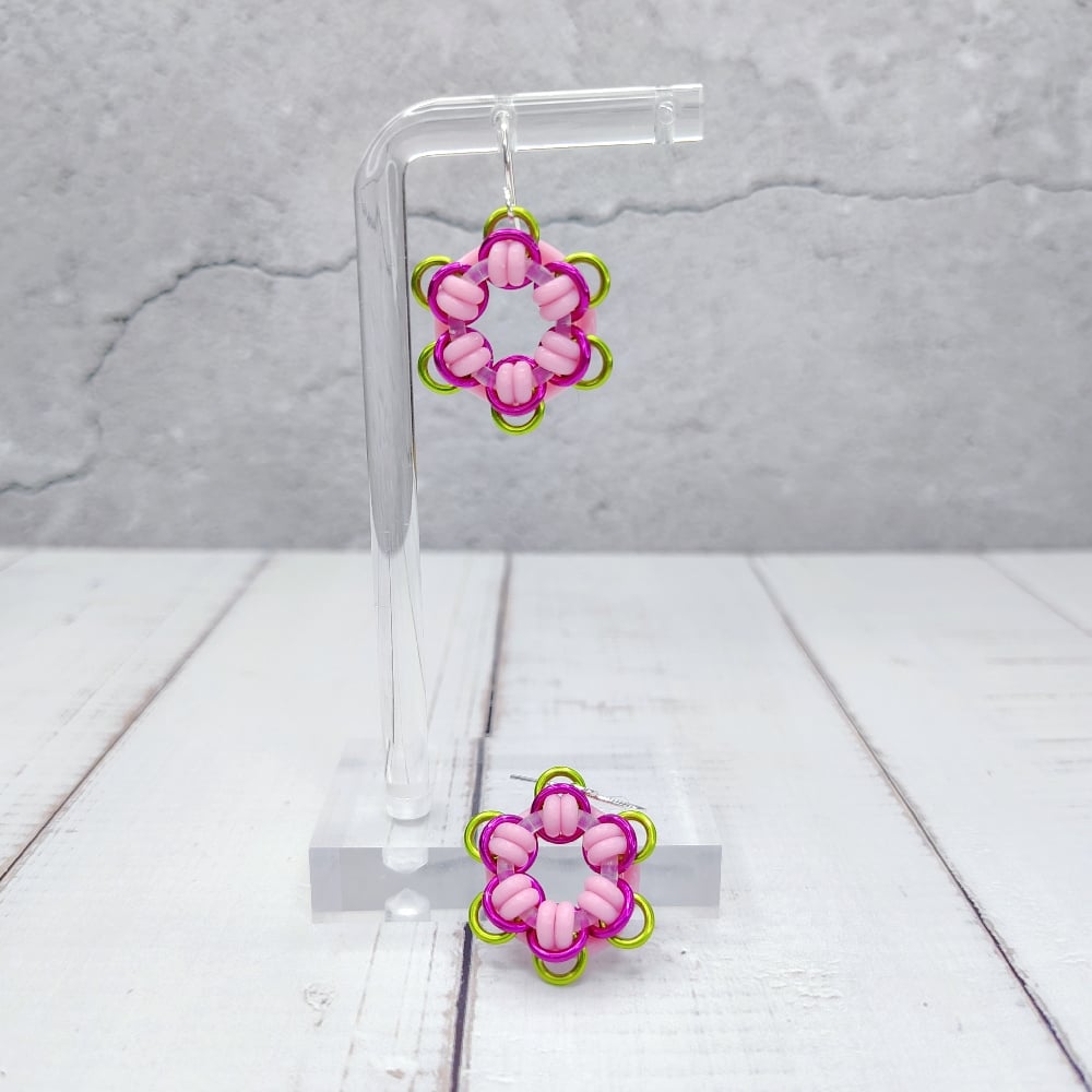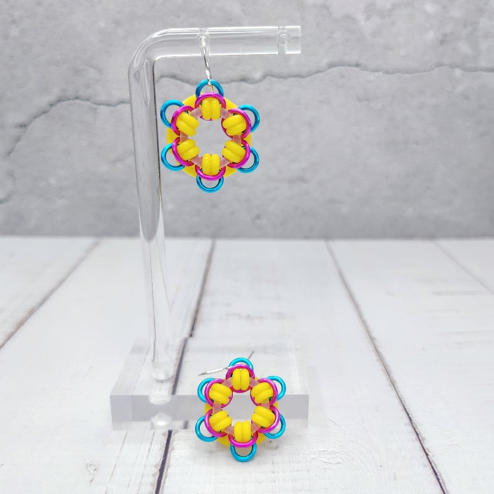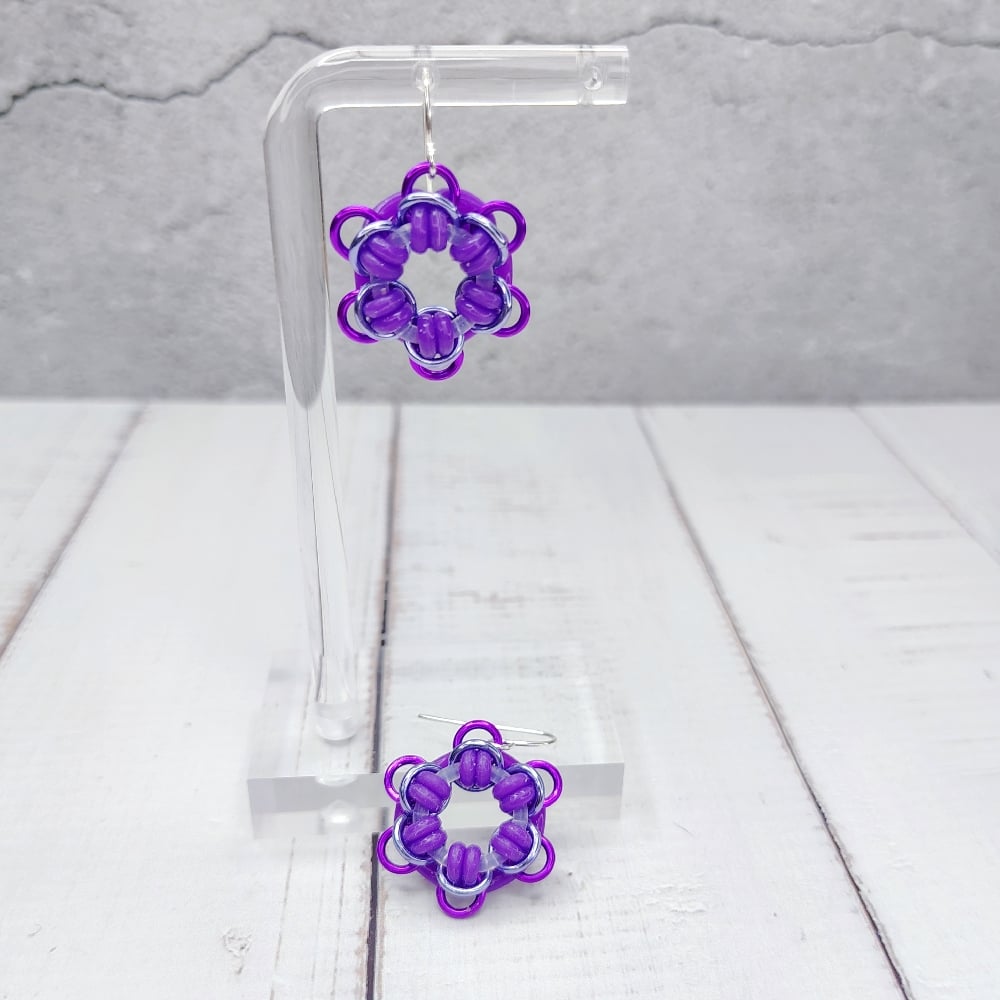 Handwoven chainmaille earrings made from a combination of anodized aluminum rings and silicone (latex free) rubber rings on nickel free ear hooks. Earrings are extremely lightweight and measure about 1" any which way.