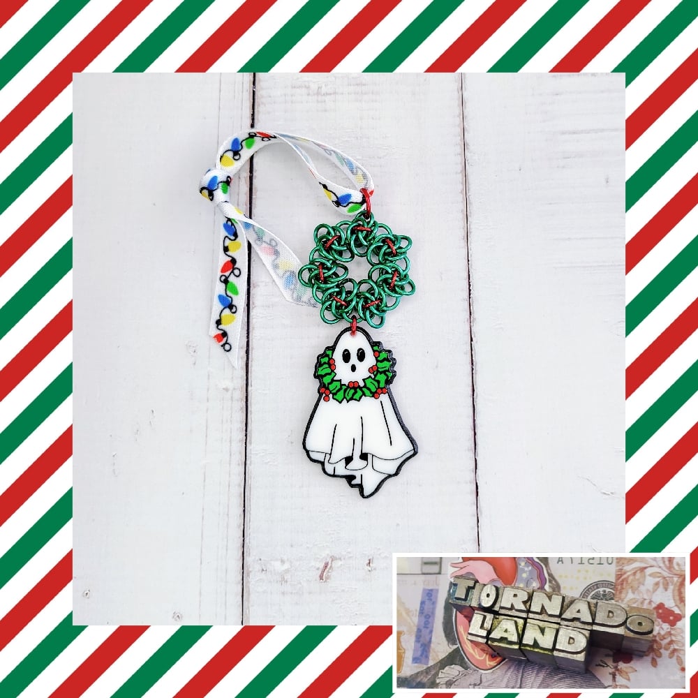 Holly Jolly Ghost Wreath OrnamentChainmaille wreath ornament handwoven with anodized aluminum rings plus double sided acrylic charm. Ornament measures about 3.25" long including charm and comes with a length of ribbon as pictured.
