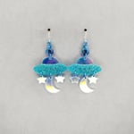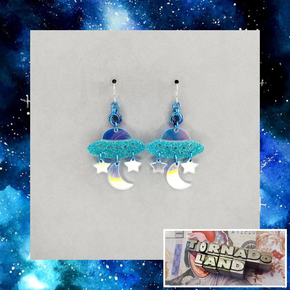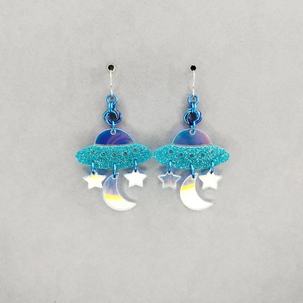 Handwoven multi-color 'moebius' chainmaille units made from anodized aluminum rings with iridescent and glittery 3D acrylic charms on nickel free ear hooks. Earrings are extremely lightweight and measure just over 2.25" at the longest point.