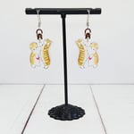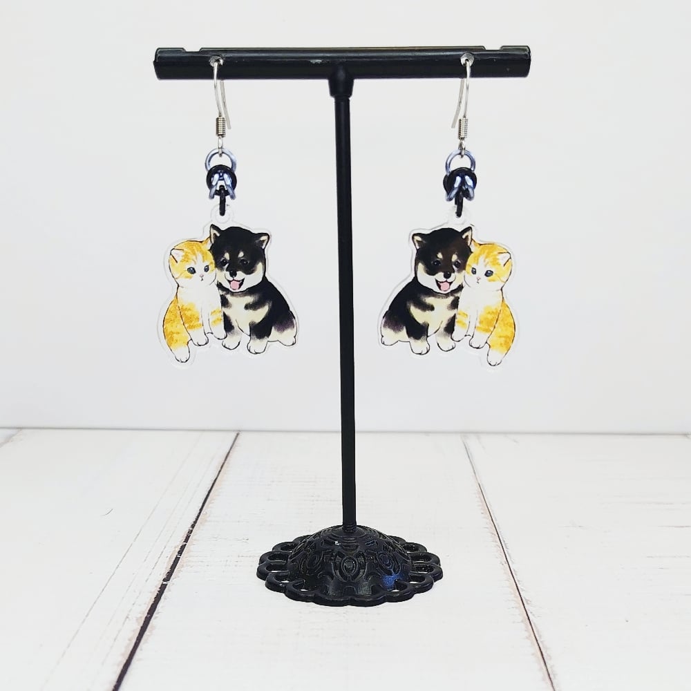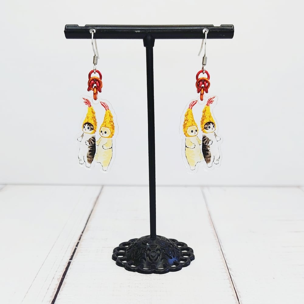Handwoven mini 'half byzantine' chainmaille units made from anodized aluminum rings plusdouble sided acrylic charms on nickel free ear hooks. Earrings are extremely lightweight and measure just under 1.5" long.