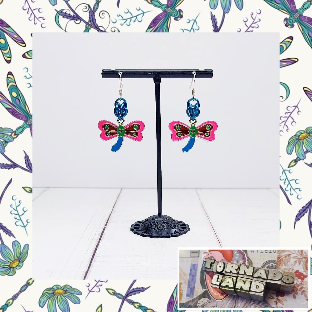 Handwoven 'sweet pea' chainmaille units made from anodized aluminum rings plus enamel charms on nickel free ear hooks. Earrings are extremely lightweight and measure 1.5" long.