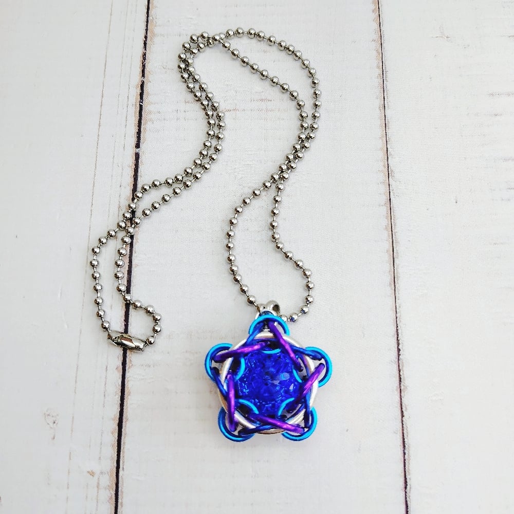 Chainmaille 'Asteris' unit handwoven with bright aluminum and anodized aluminum rings capturing a 14mm Swarovski crystal rivoli in the shade of 'Majestic Blue.' Pendant measures 1.25" any which way and comes on 30" of ball chain.