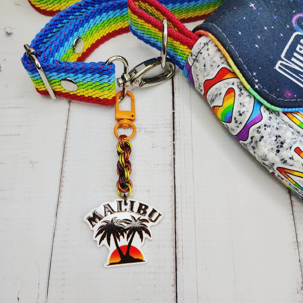 Malibu Purse CharmHandwoven 'double spiral' chainmaille made from anodized aluminum rings with acrylic charm on metal swivel clasp. Purse charm measures 4" long in total.