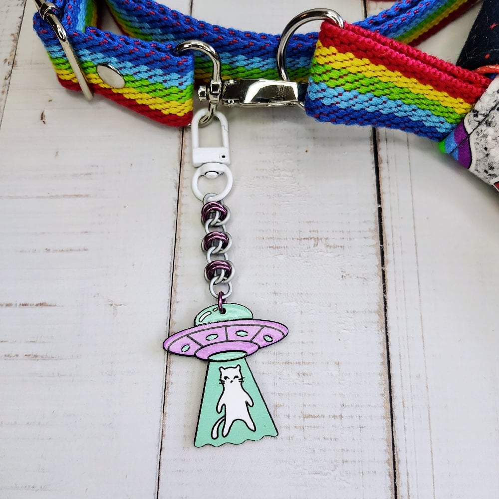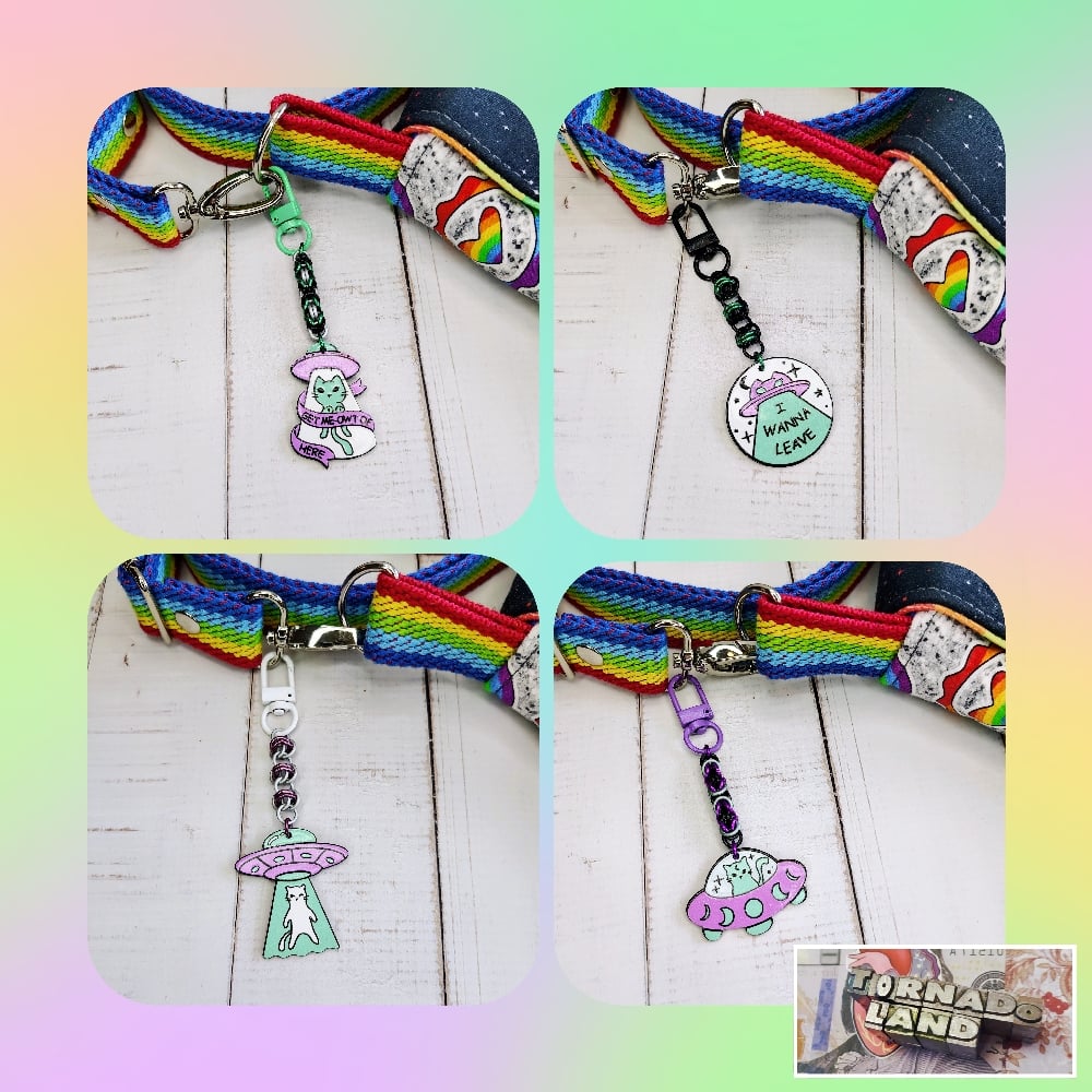Handwoven chainmaille units made from anodized aluminum rings with acrylic charm on metal swivel clasp. Purse charms each measure between 3.5"-4" long in total.