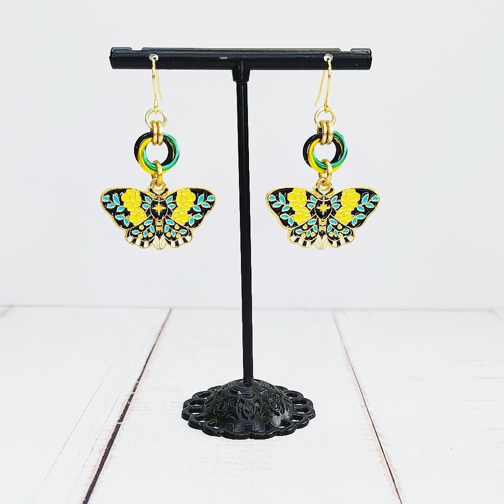 Handwoven multicolor 'moebius' chainmaille units made from anodized aluminum rings plus enamel charms on nickel free ear hooks. Earrings are extremely lightweight and measure just over 1.25" long.