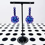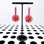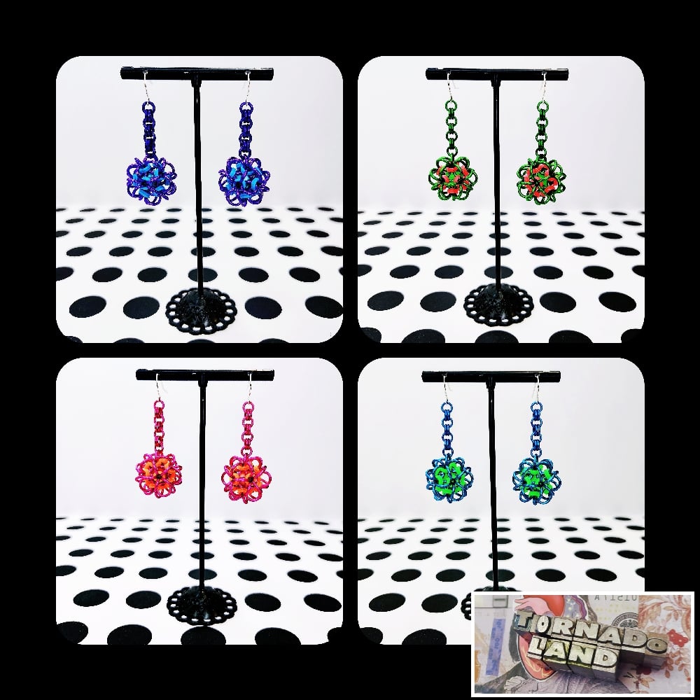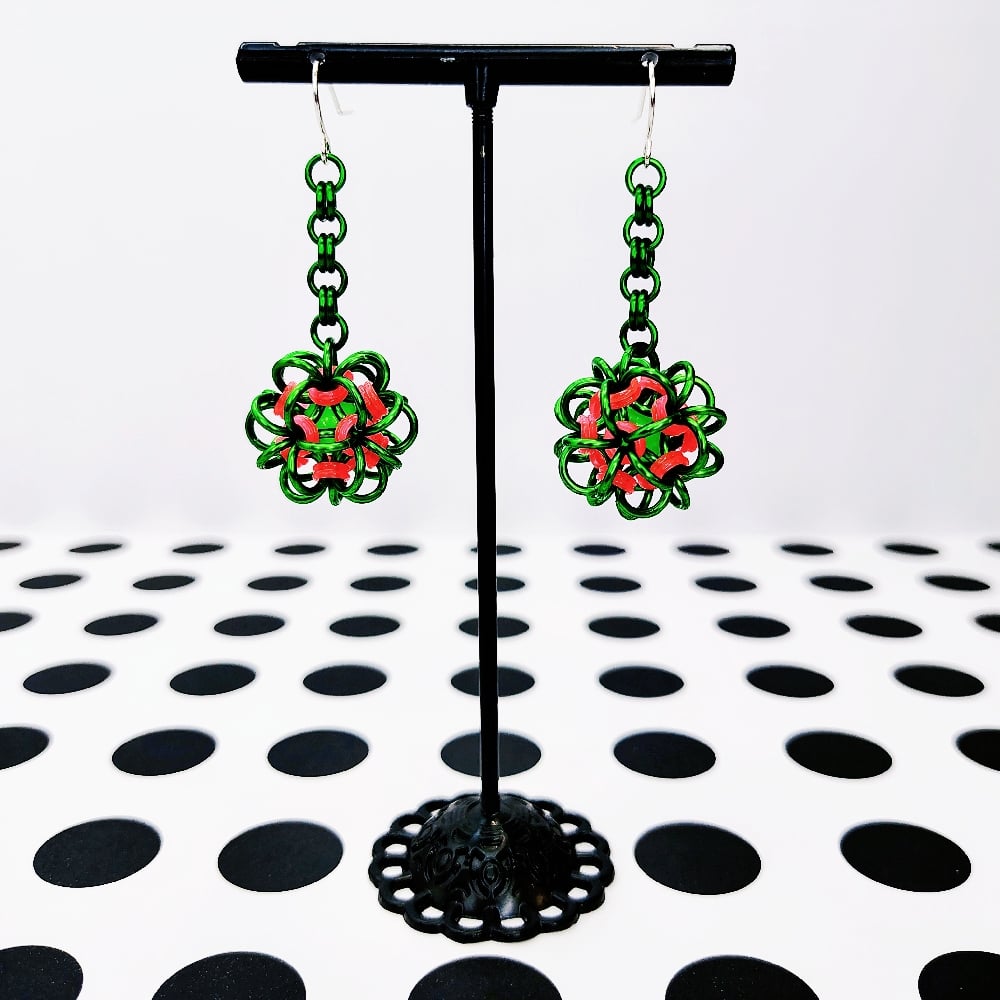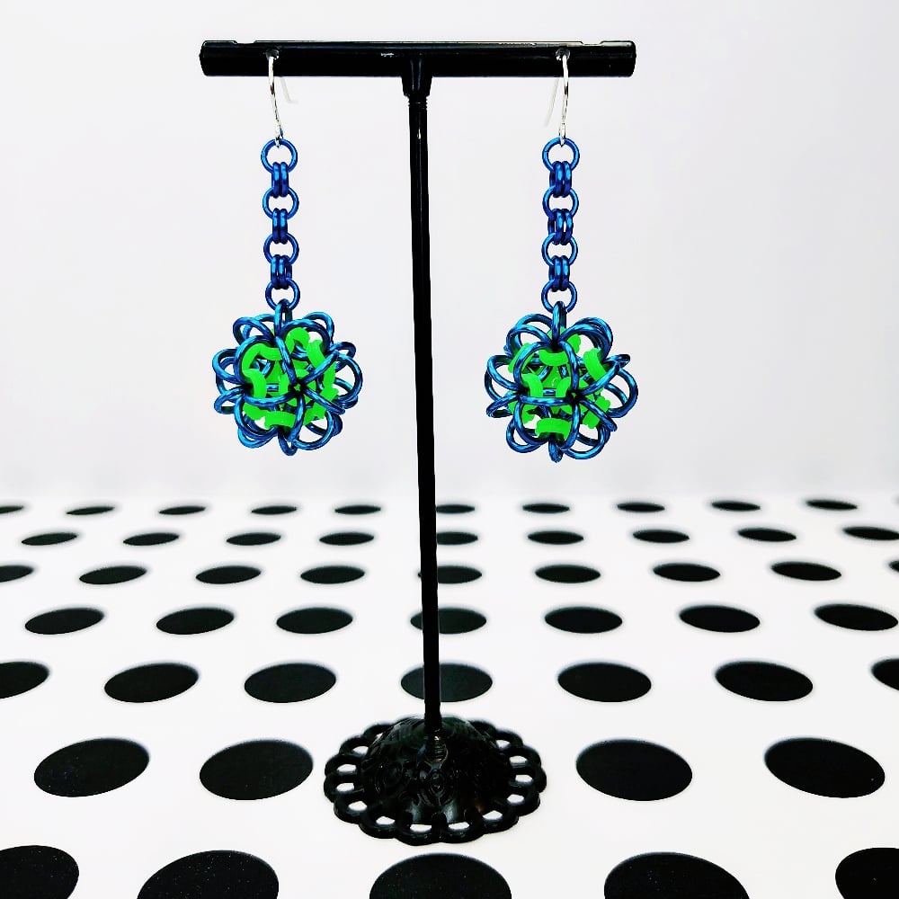 Handwoven chainmaille dodecahedron balls made from anodized aluminum rings and neon rubber rings on nickel free ear hooks. Earrings are extremely lightweight and measure 1.75" long.