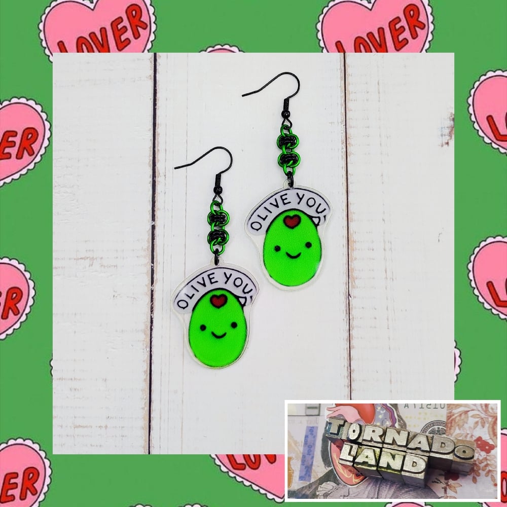 Handwoven mini 'barrel weave' chainmaille units made from anodized aluminum rings plus double sided acrylic charms on nickel free ear hooks. Earrings are extremely lightweight and measure just over 2" long.