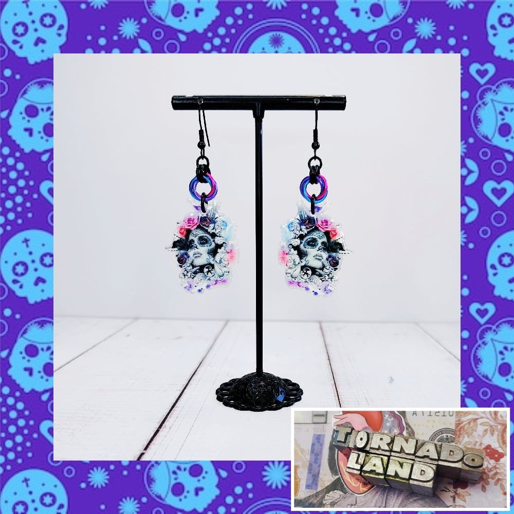 Handwoven multi-color 'moebius' chainmaille units made from anodized aluminum rings with double sided acrylic charms on nickel free ear hooks. Earrings are extremely lightweight and measure 2" long.
