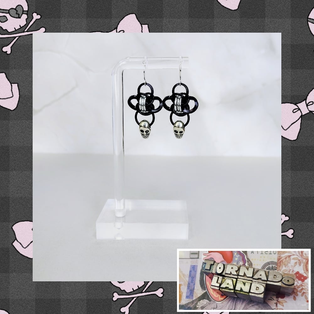 Handwoven 'Persephone' chainmaille units made from square and round anodized aluminum rings plus metal skull charms on nickel free ear hooks. Earrings are extremely lightweight and measure just over 1.5" long.