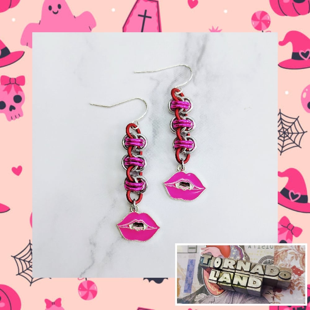 Handwoven 'barrel weave' chainmaille units made from anodized aluminum rings with enamel charms on nickel free ear hooks. Earrings are extremely lightweight and measure 1.75" long.