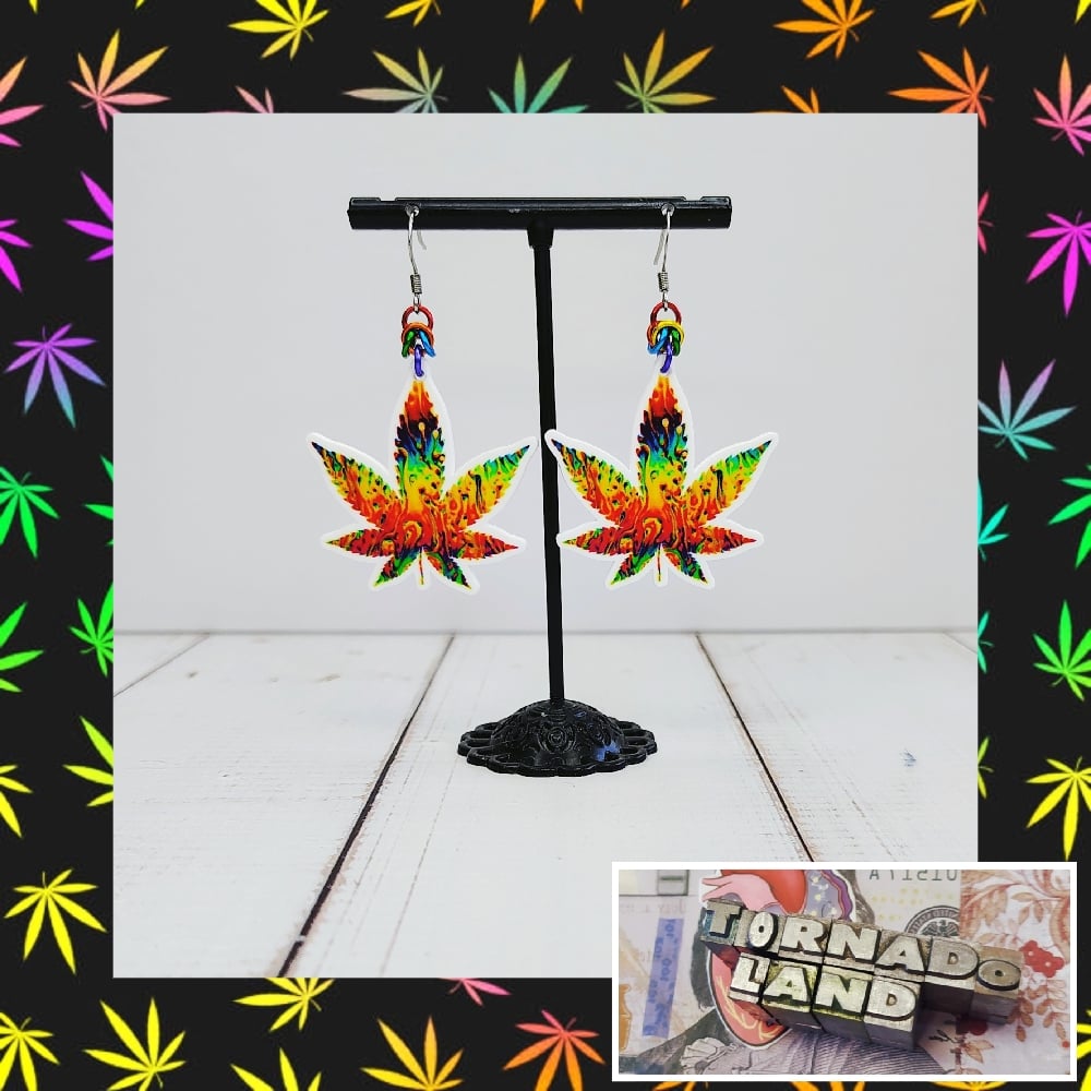 Psychedelic Pot Leaf EarringsHandwoven mini 'half byzantine' chainmaille units made from anodized aluminum rings with acrylic charms on nickel free ear hooks. Earrings are extremely lightweight and measure just under 2" long.