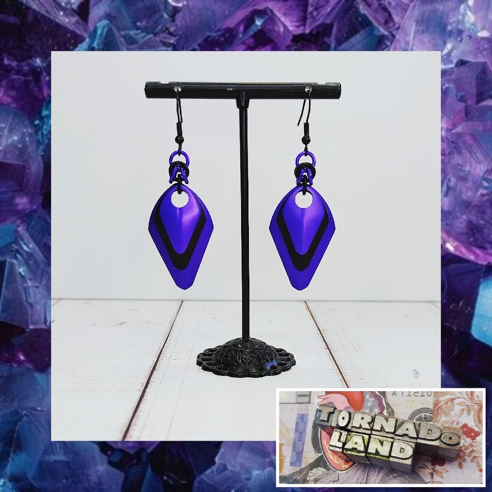 Three sizes of premium anodized aluminum serpent scales with handwoven 'half-byzantine' chainmaille units made with anodized aluminum rings on nickel free ear hooks. Earrings are extremely lightweight and measure just over 1.75" long.