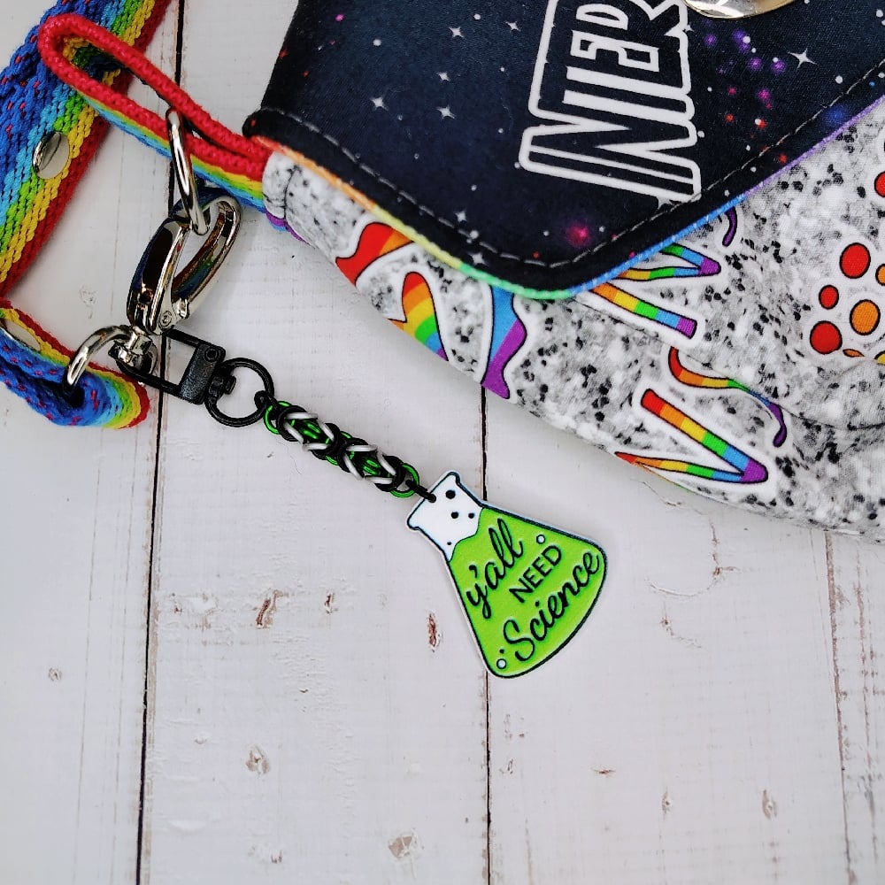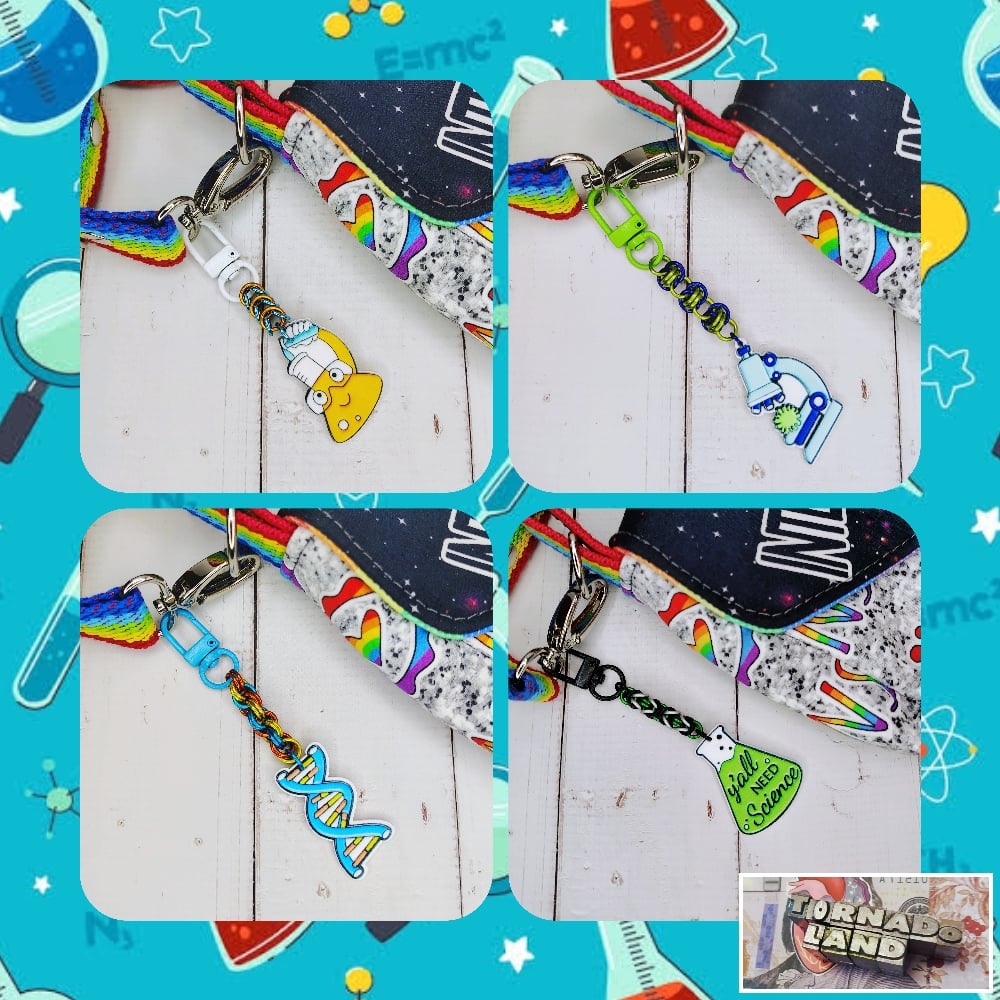 Handwoven chainmaille units made from anodized aluminum rings with acrylic charm on metal swivel clasp. Purse charms each measure between 3.25"-4.25" long in total.