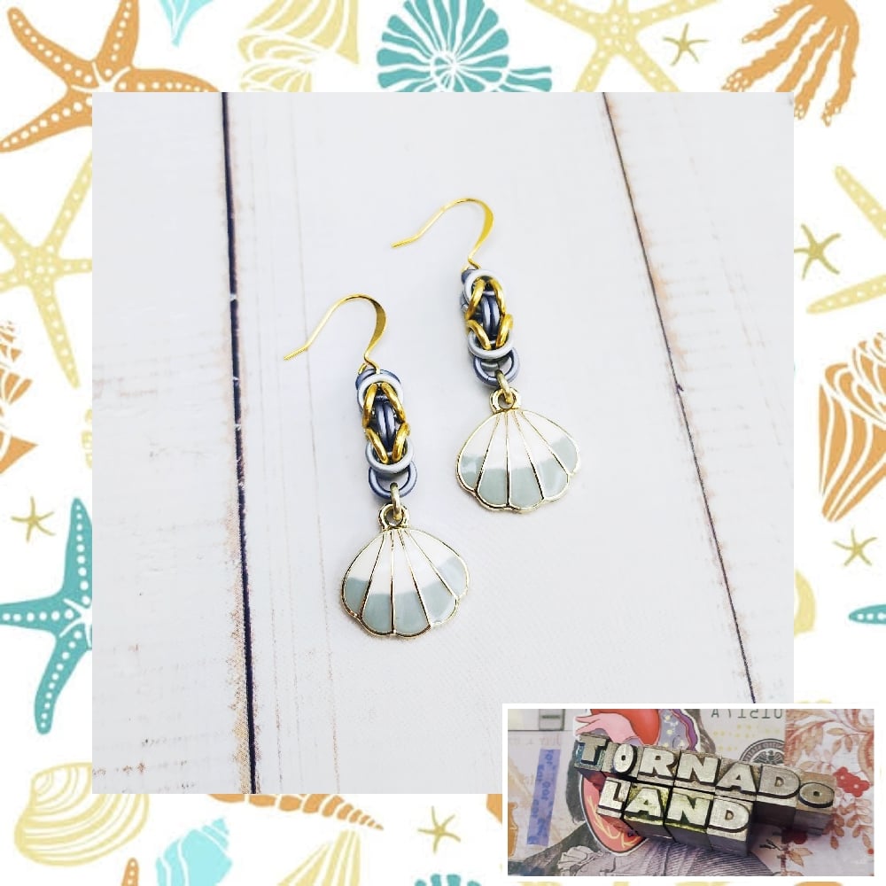 Sea Shell Earrings Handwoven 'byzantine' chainmaille units made from anodized aluminum rings plus enamel charms on nickel free ear hooks. Earrings are extremely lightweight and measure just over 1.5" long.