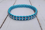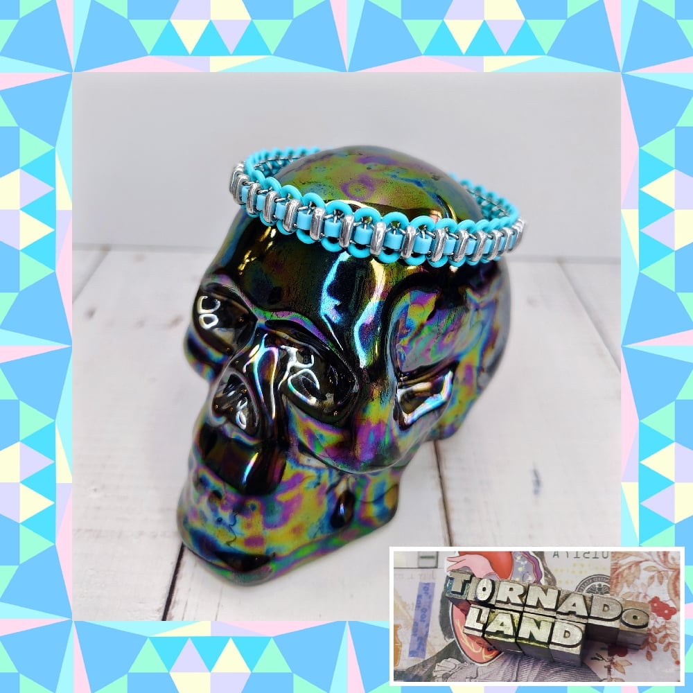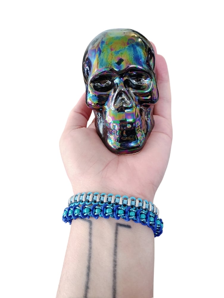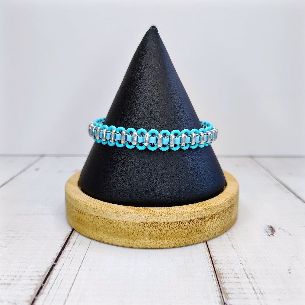 Handwoven latex free rubber and stainless steels rings plus delica glass seed beads and Czech glass bar beads. This bracelet is very lightweight and sturdy. Stretches to fit most adult wrists.
