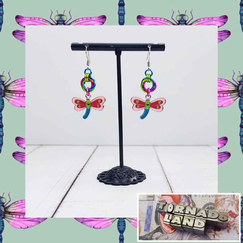 Handwoven 'moebius' chainmaille units made from anodized aluminum rings plus enamel charms on nickel free ear hooks. Earrings are extremely lightweight and measure just over 1.5" long.