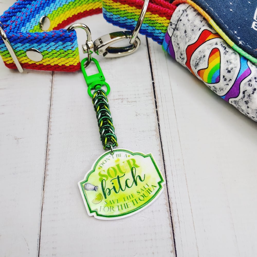 Sour B*tch Purse CharmHandwoven 'box weave' chainmaille made from anodized aluminum rings with acrylic charm on metal swivel clasp. Purse charm measures 4" long in total.