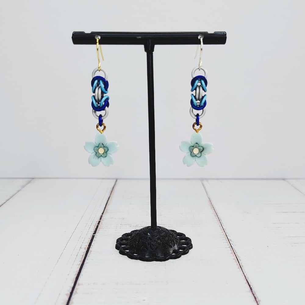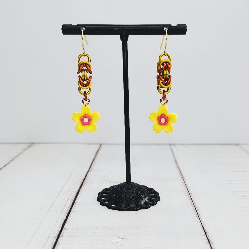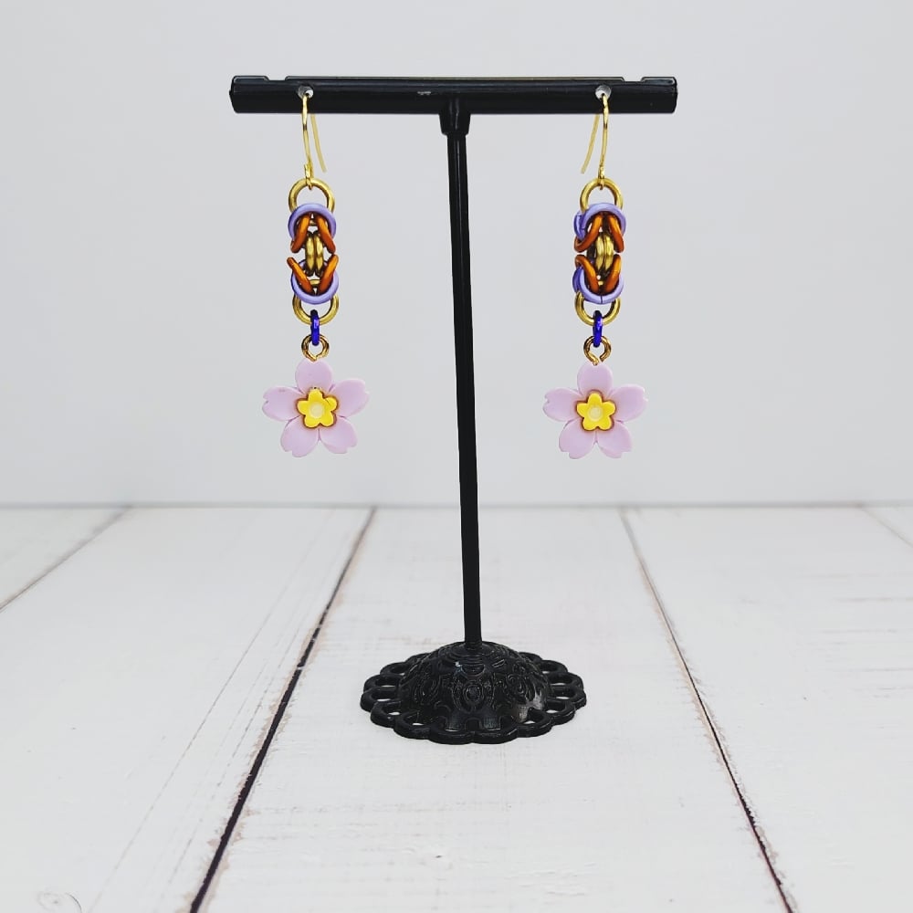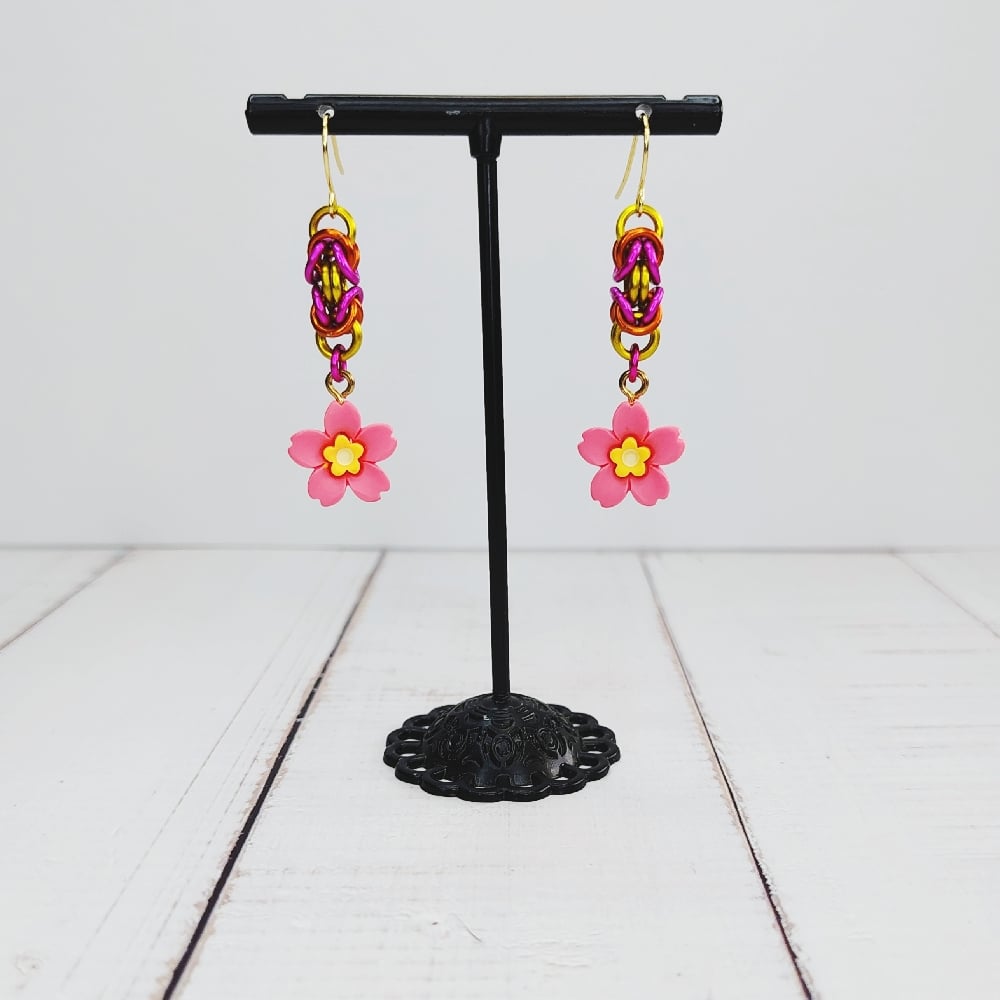 Handwoven 'byzantine' chainmaille units made from anodized aluminum rings plus 3D acrylic charms on nickel free ear hooks. Earrings are extremely lightweight and measure 1.5" long.