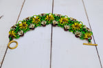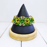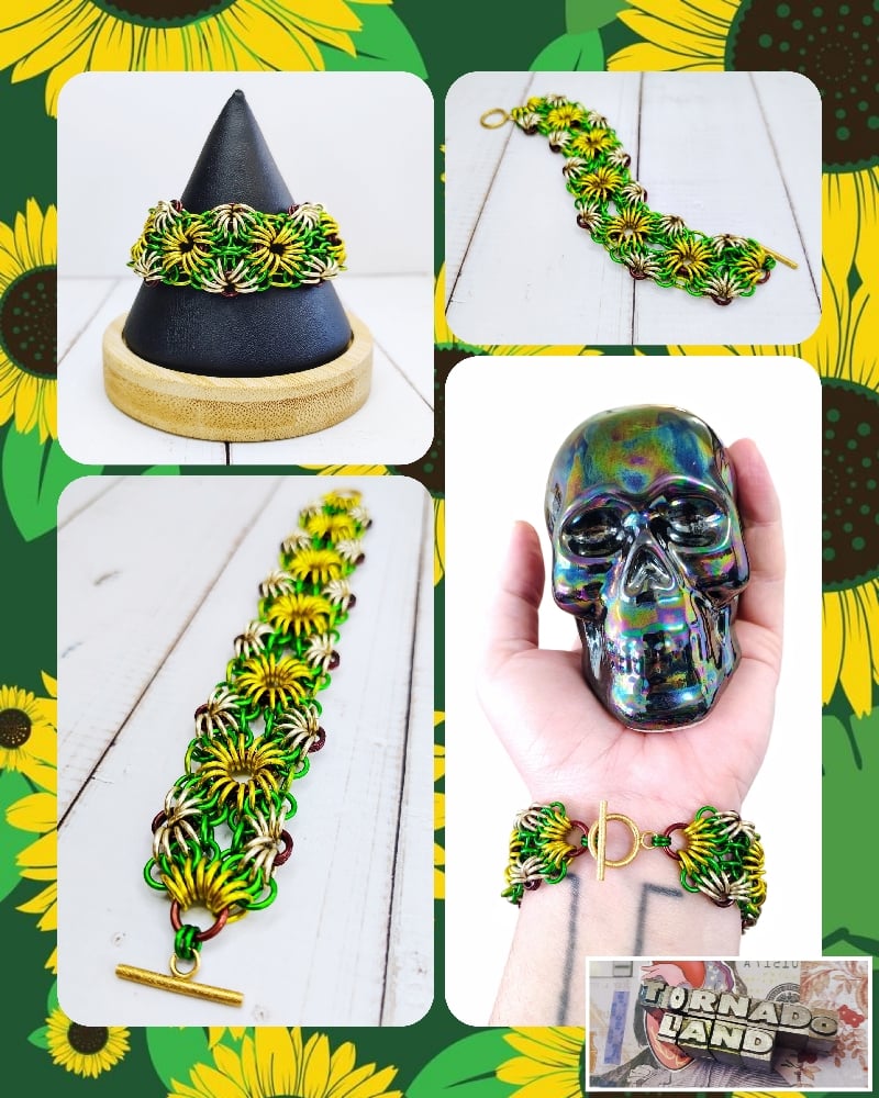 Handwoven sunflower motif chainmaille bracelet made from nearly 300 anodized aluminum rings. Bracelet closes with a gold toned toggle clasp and measures about 8" but can be custom sized upon request.