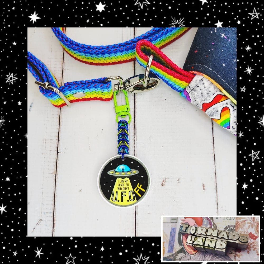 UFOff Purse CharmHandwoven 'box weave' chainmaille made from anodized aluminum rings with acrylic charm on metal swivel clasp. Text on charm reads: "I Like My Space So Why Don't U F OFF." Purse charm measures just under 4" long in total.