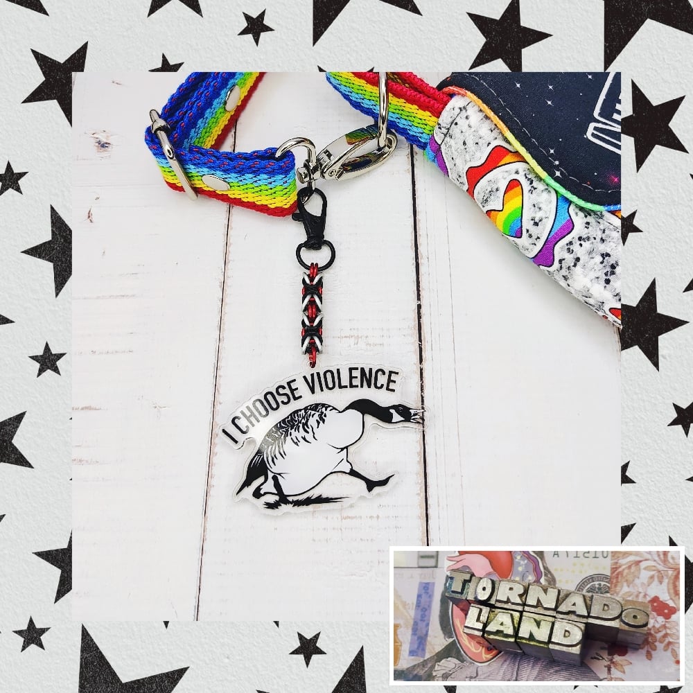 Violent Goose Purse Charm Handwoven 'byzantine' chainmaille made from anodized aluminum rings with acrylic charm on metal swivel clasp. Purse charm measures 4" long in total.