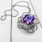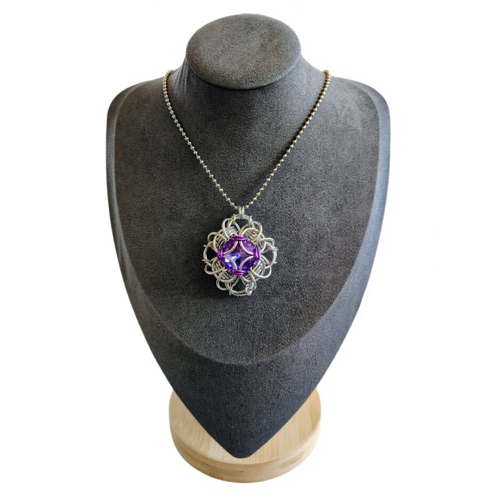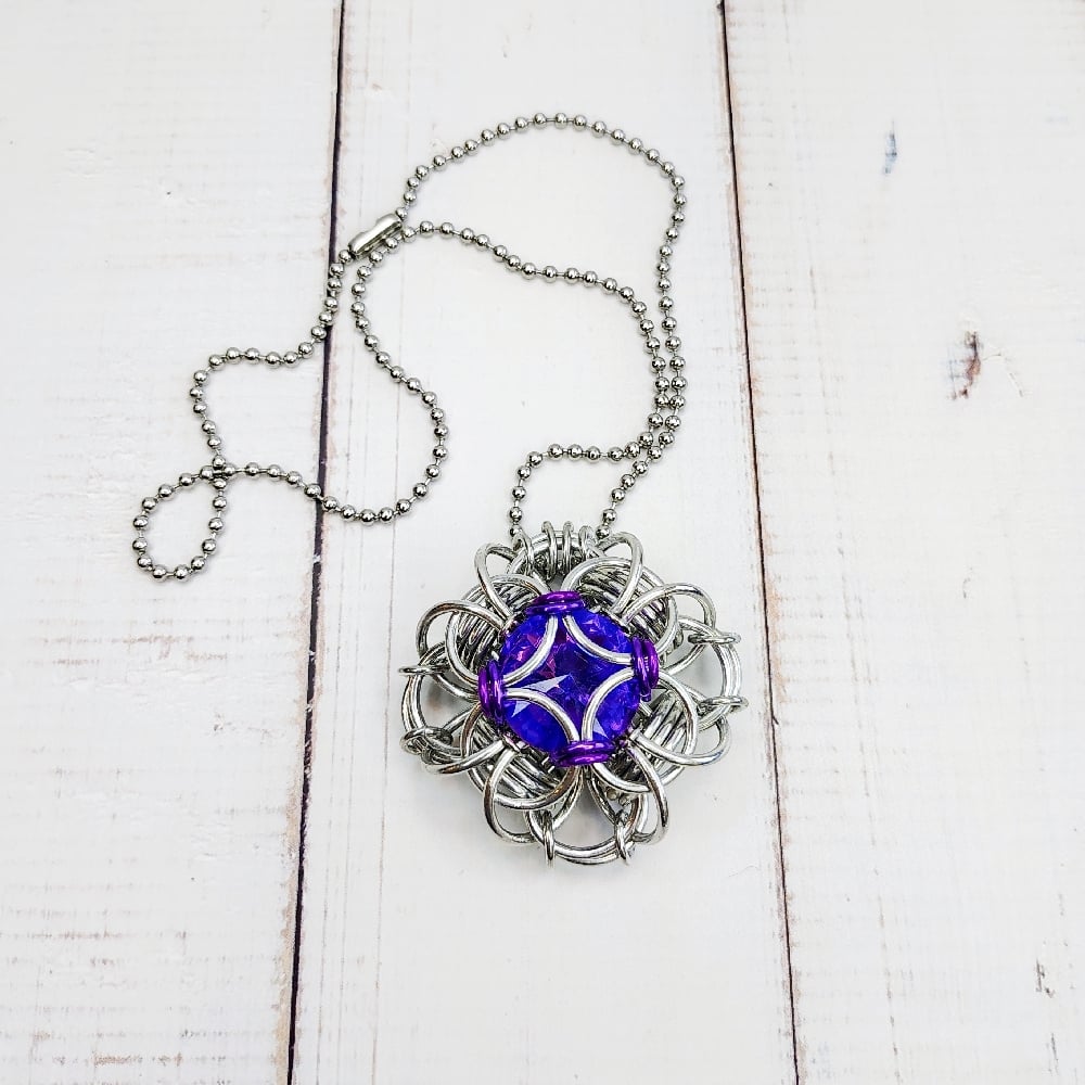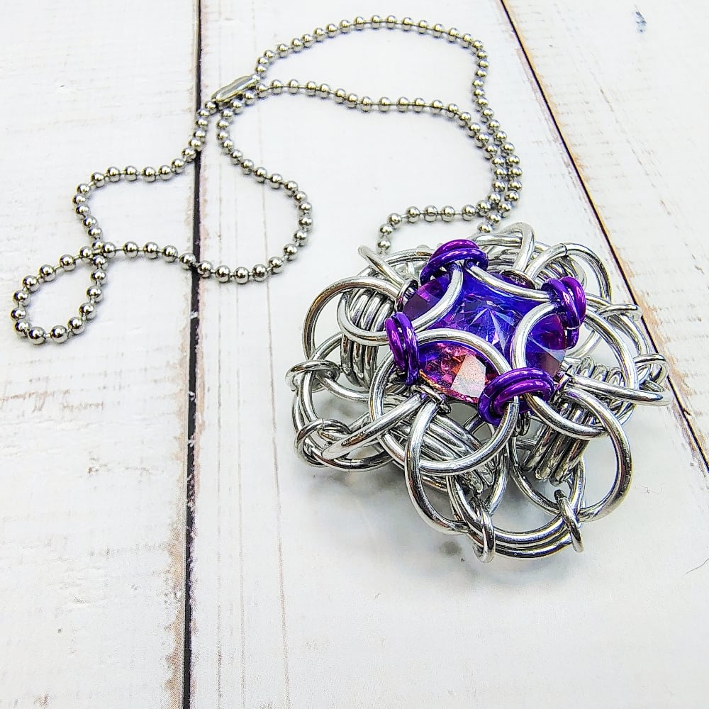 Chainmaille 'Queen's Reign' unit handwoven with bright aluminum and anodized aluminum rings capturing an 18mm crystal rivoli in the shade of 'Violet Blue.' Pendant measures 2" any which way and comes on 30" of ball chain.